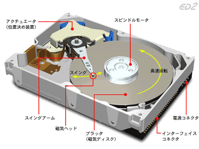 ハードディスク装置は、プラッタ、スピンドル、スイングアーム、磁気ヘッド、アクチェータ(ヘッド位置決め装置)によって構成される。