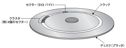 「フロッピーディスク」は、「トラック」と「セクタ」から構成されています。データはセクタ単位に記憶されます(セクタ方式)。読み書きは、磁気ヘッドとディスク面は接触して行う。