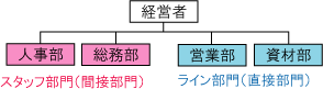 • 直接部門(ライン): 販売部、製造部などのように、組織の目的を直接遂行する部門