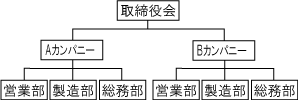 本社部門の下に、事業部制組織における事業部門よりも、自立性・独立性が高い事業部門(カンパニー)を配置した組織形態。