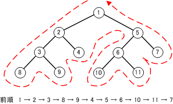 節点→左部分木→右部分木の順で走査する。