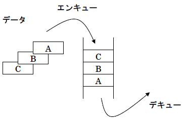 キューにデータを格納することをエンキュー(ENQUEUE)、キューからデータを取りだすことをデキュー(DEQUEUE)と言います。