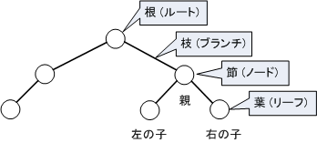 一番根元の部分の要素を根、要素と要素をつなげる部分を枝、途中の要素部分を節、枝の一番先端にある要素を葉とよぶ。