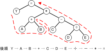 後順を使うと逆ポーランド記法になおせる。