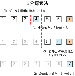 順番に整列されたデータのうち中央の要素のデータと探索データを比較し、中央値でデータを2分し、中央値より大きいか小さいかでその前半分のデータか後半分のデータのどちらかを使うか判定する。これを繰り返していく。