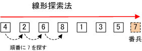 先頭から順番に1つづつデータを探していく方法。リニアサーチや順次探索法ともいう。
