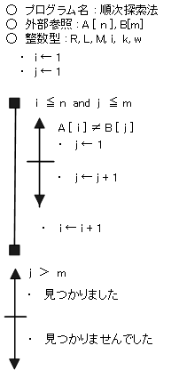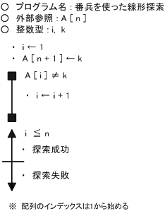 線形探索のフローチャート(擬似言語)