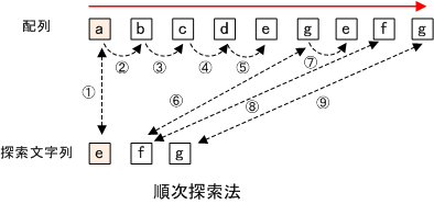 配列に格納されている文字列から特定の文字を探索するアルゴリズムのこと。