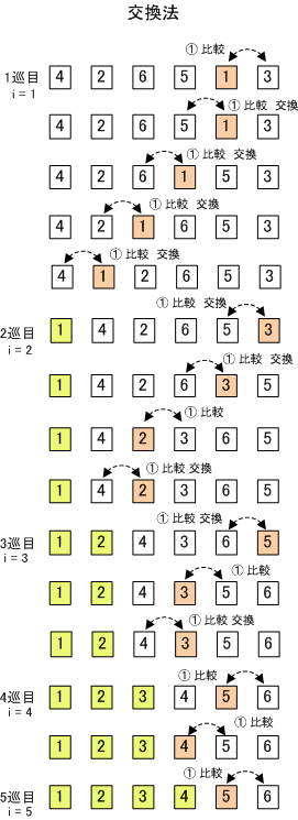 もしデータ数が6個であれば(先頭を1番目とする)、6番目(A[6])と5番目(A[6-1]=A[5])を比較し、大小が逆であれば入れ換える。次に5番目(A[5])と4番目(A[5-1]=A[4])を比較して入れ換える。これを最後まで行うと、最後の1番目(A[1])が最小または最大の数として確定する。再度、後ろ(A[6])から比較していき、確定していない部分について比較していき、確定しない最後(2番目まで)(A[2])まで比較していく。これを最後まで繰り返す。