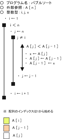 バブルソートのフローチャート(擬似言語)