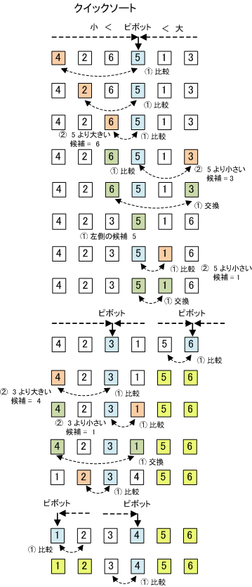 「クイックソート」は、整列の対象の配列を分割しながら整列を進めます。具体的には、全データから基準値(ピボット)を選び、その値を境にし、より「大きいデータ」と「小さいデータ」のグループになるように振り分けます。この作業を繰り返して行います。また、クイックソートは、「再帰呼出し」と言って、「ある手続きの中から自分自身を呼び出す」方法を用いても実現できます。