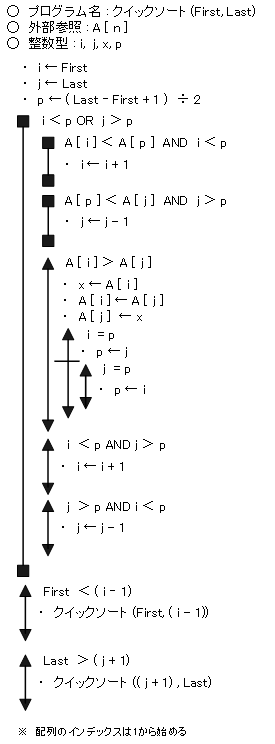 クィックソートのフローチャート(擬似言語)
