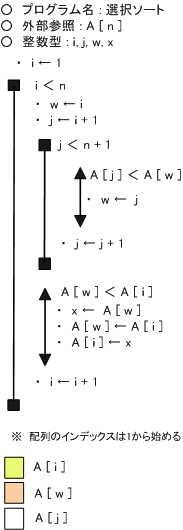 選択ソートのフローチャート(擬似言語)