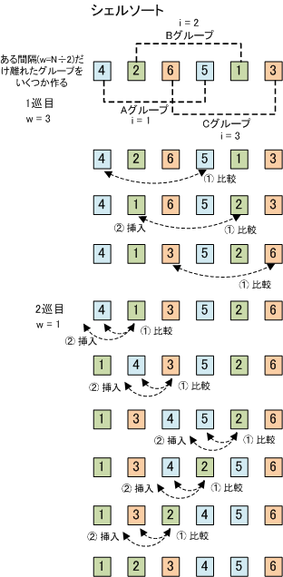「シェルソート」は、ある程度整列されたデータに対して有効である。この方法は、「挿入法」を応用して、一定間隔ごとにデータを振り分け、これを挿入法で整列させて、その間隔を順次、狭くしていく方法です。