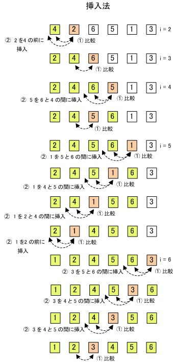 2番目(A[1+1])と1番目(A[1])を比較し、大小が逆であれば入れ換える。次に、3番目(A[2+1])のデータと2番目(A[2])のデータを比較し、大小が順序通りなら、3番目のデータの比較終了。もし大小が逆であれば、2番目のデータと3番目のデータを入れ替える。入れ替えた2番目のデータ(元々は3番目のデータ)と左側のデータ(1番目のデータ)とを比較し、大小が逆なら入れ替え、正しければそのままにする。これで3番目のデータの位置が決定される。比較するデータを整列済みのデータのグループの中で正しい順に並ぶように「挿入」していく。(挿入する際、左側のデータを後ろに一つずつずらす。)この操作で、3番目までのデータが整列済みとなる(但し、データが挿入される可能性があるので確定ではない)。つぎに4番目以降のデータについて、整列済みデータとの比較と適切な位置への挿入を繰り返す。4番目のデータと左側のデータを比較して、大小が正しければ、その時点で4番目の位置はそのままの位置で順序通りになる。
