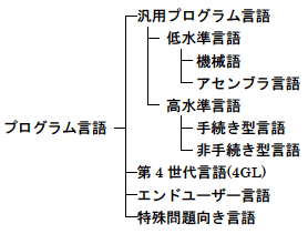 高水準言語は手続き型言語(手続き向き言語)と非手続き型言語(非手続き向き言語)に分かれる。前者は、処理の順序を流れ図に従ってプログラミングするが、後者は、プログラムに何をさせるか簡潔に記述するだけで、処理手順を細かく意識する必要はない。オブジェクト指向言語のJavaやC++などがある。