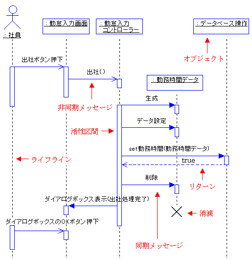 ライフライン間を結ぶ水平の矢印(左右どちら向きでもOK)とメッセージ名で表現します。 矢印には、同期と非同期の2種類があり、先端の形状が異なります。同期的なメッセージは黒三角の矢じり、 非同期的なメッセージは「く」の字の矢じり(*)です。同期的とは、 メッセージのリターンを待って次の処理に進むような場合で、通常のプログラミング言語の関数呼び出しです。 非同期的とは、リターンをまたずに次の処理に進む場合で、例えば受け側が別のスレッドで動いており、 キューにメッセージを貯めているような場合に相当します。