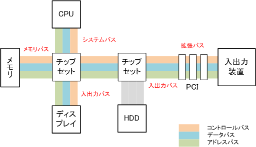 CPUや主記憶装置、入出力装置などのそれぞれの装置が共通の伝送路であるバスで接続されている。