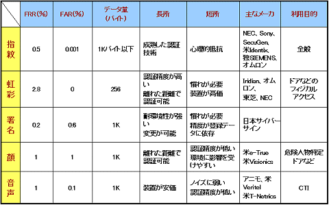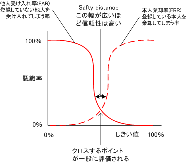 生体認証では、原理的に、本人であるにもかかわらず本人ではないと誤認識してしまう「本人拒否率」(第一種過誤、擬陽性 FRR:False Rejection Rate)と他人であるにもかかわらず本人と誤認識してしまう「他人受入率」(第二種過誤、擬陰性 FAR:False Acceptance Rate)がトレードオフの関係にある。