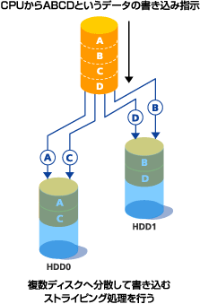耐障害性の無いディスクアレイ(ストライピング)で、データをブロック単位に分割し、複数のディスクにわたって分散してデータを記録する。このため、ディスクをまたがってデータが帯状に配置されることから「ストライピング」とも呼ばれる。
