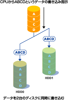アクセス速度の向上はありませんが、ディスク故障に起因するデータの損失やシステムの停止が起こらない。一方のディスクが故障したときに、もう一方のディスクに自動的に切り替わってデータが処理されるので、動作はそのまま継続する。「高速化」という点では期待できませんが、「耐障害性」はよくなる。ただし、ディスクの容量全体のうち、半分しか実際には使えないので、コストパフォーマンスは低いといえる。