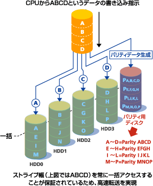 データは、ブロック単位やビットまたはバイト単位に分割され、データ専用の複数のディスクへ同時に書き込まれます。パリティは分割されたデータから生成され、パリティ専用のディスクに書き込まれます。常に全てのデータディスクに並行してアクセスし、データを一括して転送する方式であるため、高いデータ転送速度を得ることができる。