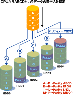 データの分割はブロック単位でパリティはすべてのハードディスクに分散して記録する。