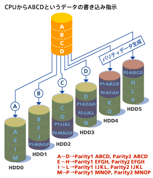 RAID6は、2種のパリティを異なるディスクに配置すること(ダブルパリティ)により、同一RAIDグループ内の2台のディスク故障までを救済できるようにしたもの。 RAID5同様、更新するパリティが異なるディスクに配置されているため、ライト処理 が多重で発行された場合でも同時に実行することができ、RAID4に比べて高い性能を実現できる。