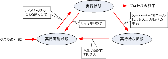 ※「ディスパッチャ」とは、実行可能状態のタスクから優先順位の高いタスクを実行状態にしたり、実行状態のタスクを中断させたり、CPUの割り当ての切り替えを行うプログラムです。