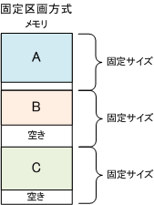 主記憶をあらかじめ一定の大きさの区画に分け、その領域にプログラムを読み込む方法を固定区画方式という。