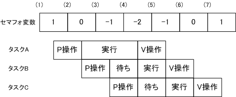 (7) タスク C の実行が終了したので、資源を解放しV操作(+1)が行われる。その結果、セマフォ変数 : 1 > 0 なので、何もせず (1) と同じ状態に戻る。