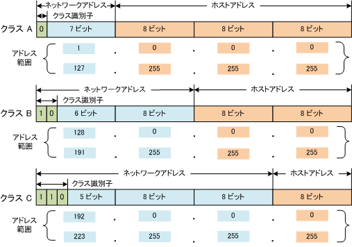アドレスクラスは、IP アドレスのネットワークアドレス部分とホストアドレス部分をどう区別するかの方法を示すものである。