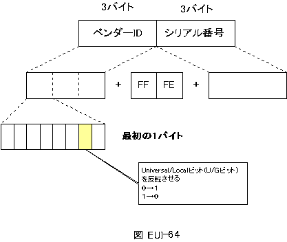 ただし、MACアドレスの長さは48ビットしかないため、そのままでは長さが足りない。そこで、以下の処理を行って、長さ64ビットのインタフェースIDを生成する。