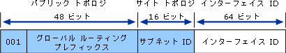 上位64ビットをネットワークプレフィックス、下位64ビットをホストアドレスと、単純に区切る。