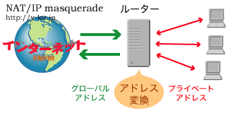 一つのグローバルなIPアドレスを複数のコンピュータで共有する技術。組織内でのみ通用するIPアドレス(ローカルアドレス)と、インターネット上のアドレス(グローバルアドレス)を透過的に相互変換することにより実現される。最近不足がちなグローバルIPアドレスを節約できるが、一部のアプリケーションソフトが正常に動作しなくなるなどの制約がある。