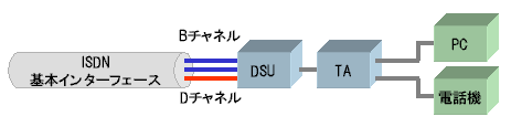 ISDN に接続するためには、DSU とターミナルアダプタ( TA )を利用する。