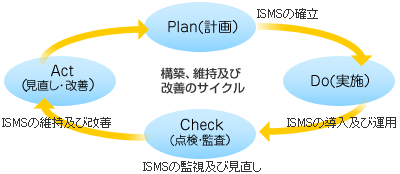 つまり、ISMSでは「情報セキュリティポリシーの意識付け」、「セキュリティ情報の収集と分析」、「実装した情報セキュリティ対策の日常的な監視」、「定期的な情報セキュリティ監査」「見直しと改善」というPDCAサイクルを繰り返すことになるのです。