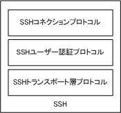 SSH プロトコルはSSH トランスポート層プロトコル、SSH ユーザー認証プロトコル、SSH コネクションプロトコルの3層のサブプロトコルから構成される。