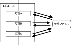 共通領域(グローバル領域)に定義されたデータを参照するモジュール。かつ必要なデータだけを外部宣言し共有する。 (機能的には関連性はない)。 | ||
