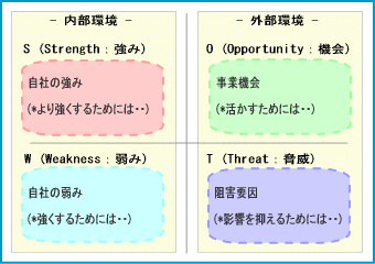 Strength (強み) , Weakness (弱み), Opportunity (機会), Threat (脅威) の頭文字からきている。