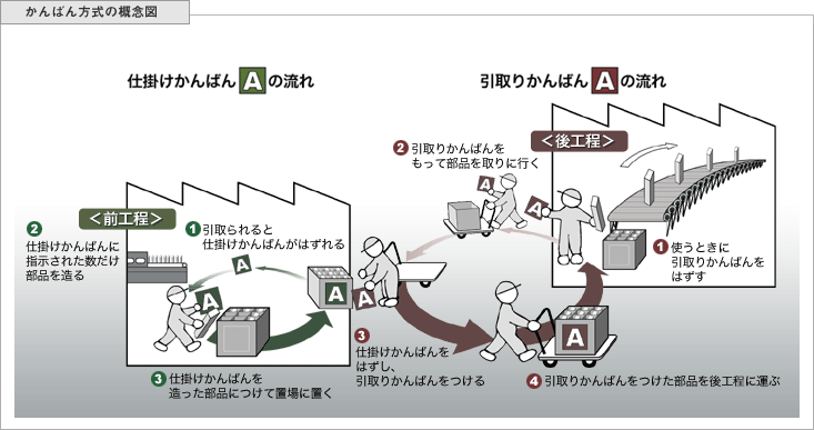 後工程が前工程に部品を調達しに行く際に、何が使われたかを相手に伝える道具として、「かんばん」を利用しています。そうすることで、前工程で無駄な作業を減らすことができます。