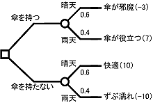 決定ノード(decision node) 意思決定者がコントロールできる変数や行動を示す。一般に四角で描かれる。行動分岐ノードともいう。 |