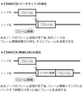 無線LANではコリジョン(同じ回線を流れる信号の衝突)を検出できないため、各端末は通信路が一定時間以上継続して空いていることを確認してからデータを送信する。この待ち時間は最小限の時間にランダムな長さの待ち時間を加えたもので、直前の通信があってから一定時間後に複数の端末が一斉に送信する事態を防止している。